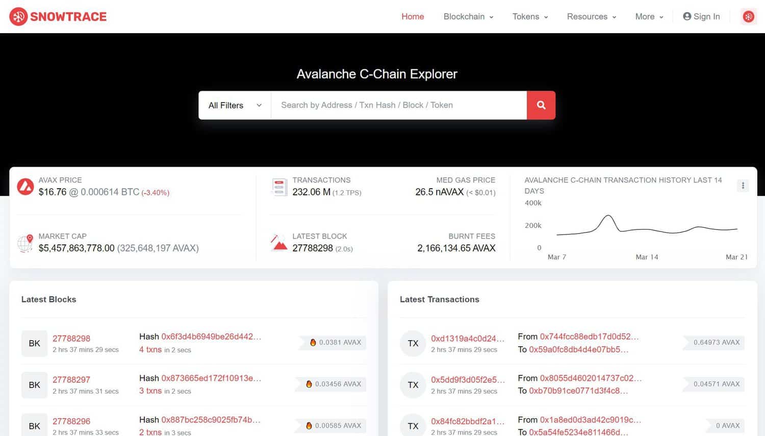 According to information from block explorer SnowTrace, the Avalanche C-Chain has failed to make a new block given that 06:26 AM on March 23, 2023 (Vietnam time).