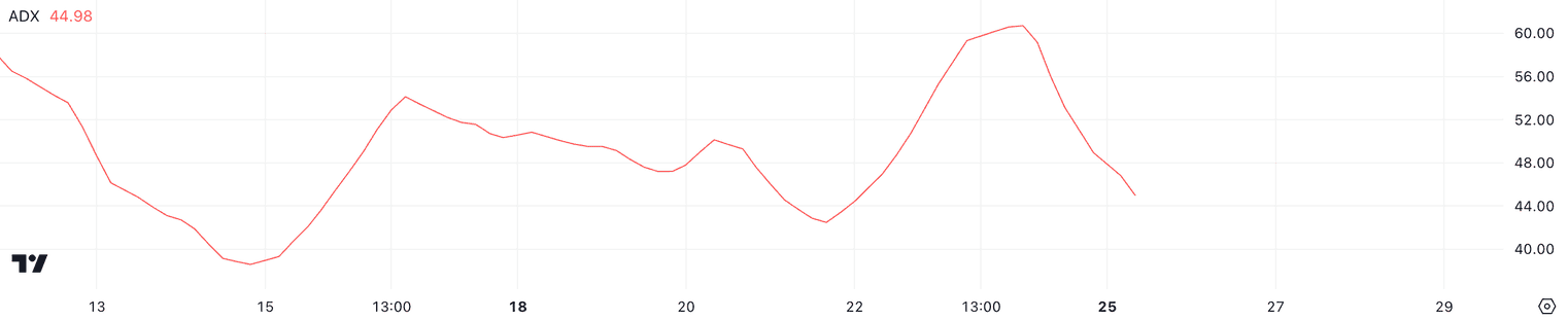 While ADX at 45 still reflects strong momentum, a decline from 60 is a sign of weakness in trend strength, even if direction remains unchanged.