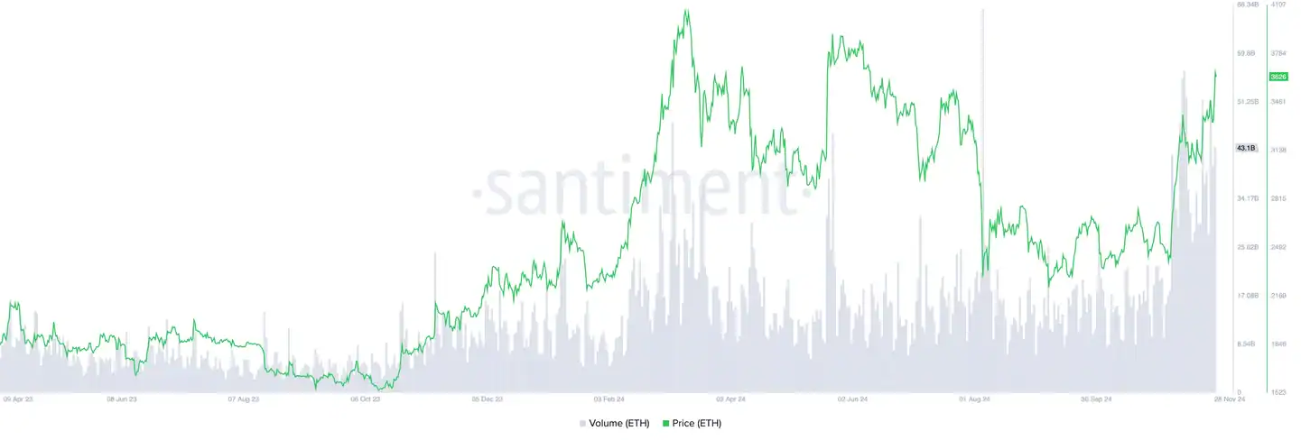 ETH trading volume has reached $43 billion in the past 24 hours. This increase in trading activity has pushed the price of the coin to levels not seen in the past five months.