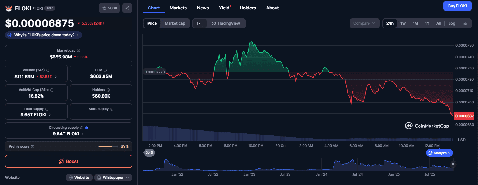 Floki Inu (FLOKI) is trading at $0.00006876, down 5.35% in the past 24 hours, as volatility in the meme coin market continues to shape short-term sentiment.