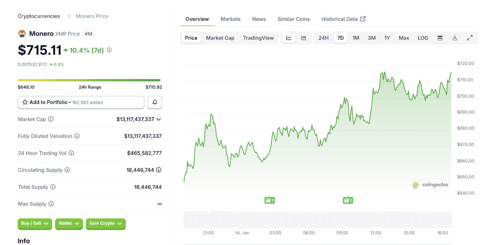The Monero (XMR) price update shows strong momentum in mid January 2026 as XMR trades between $698 and $715 after a sharp breakout above $600. The privacy focused coin now holds a market cap near $13 billion, with daily trading volume around $450 million. Circulating supply sits close to 18.4 million XMR, keeping scarcity intact. This move follows weeks of steady buying as privacy demand returns across global markets.