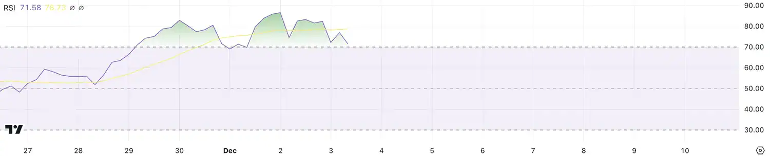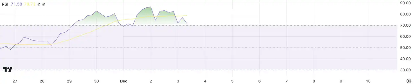 The Relative Strength Index (RSI) for XRP has maintained an overbought position above 70 since late November, peaking near 90 before falling to 71.5. This extended period in the overbought zone is consistent with Ripple’s significant price increase, indicating strong bullish momentum that has dominated the market for weeks.